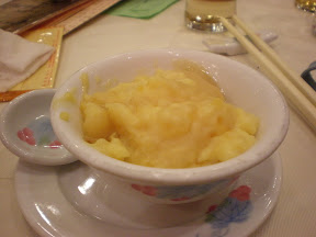 原是一碟甜味頗重的甜品,由於有十三人分享,變成十分美味的甜品。這是傳統點心,一種普通但味道好的點心。兒時在上茶樓時,總會在售賣油炸點心的點心車上看見的西米布甸。喜愛甜點的筆者,總是留下肚子空間,最後要求一碗蓮蓉西米布甸獨自享用。姐姐常說:好膩的甜品!可是,對於愛好甜品的筆者,就是上佳的飯後甜品。近年上茶樓,點心車不見了,換來是一張一張的點心紙,蓮蓉西米布甸近乎絕跡。曾經吃過全香港最難吃的蓮蓉布甸,布甸只是用黃蓮蓉強塞於內,西米很大粒,有點像台灣珍珠。加上,點心師傅放得太多糖,好像吃下半盒白糖一樣。最惡劣是,沒有焦香了的布甸外層,只有一張枯黃的面孔。既難看,又難吃的點心,是難忘的經歷。