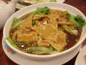 第五碟菜:蠔油螺片西生菜。可是,怎樣看,這些都不是螺片,應該是鮑魚菇。味道方面,筆者覺得廚藝一般的媽媽在新年時做的同一菜式,較它更出色。